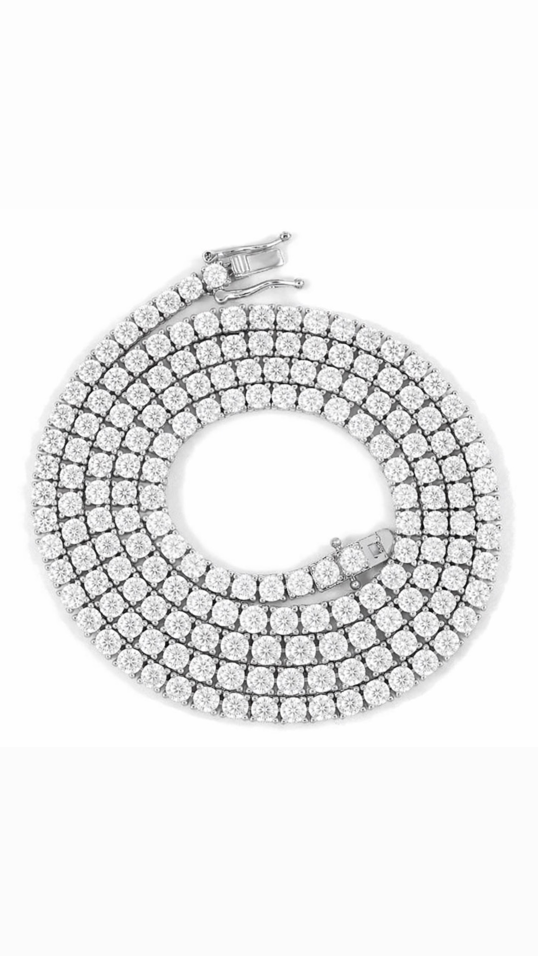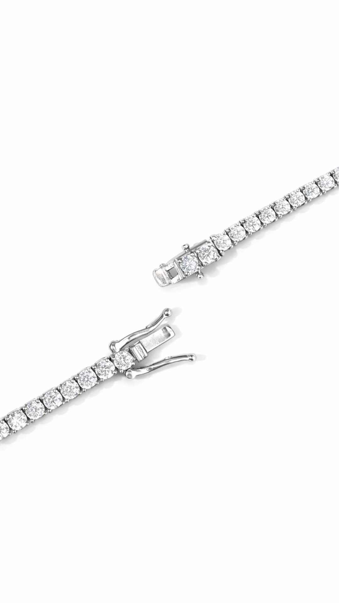 Uma corrente tennis em prata premium, cravada com pedras VVS de elevada clareza, desenhada para quem aprecia luxo subtil e intemporal.